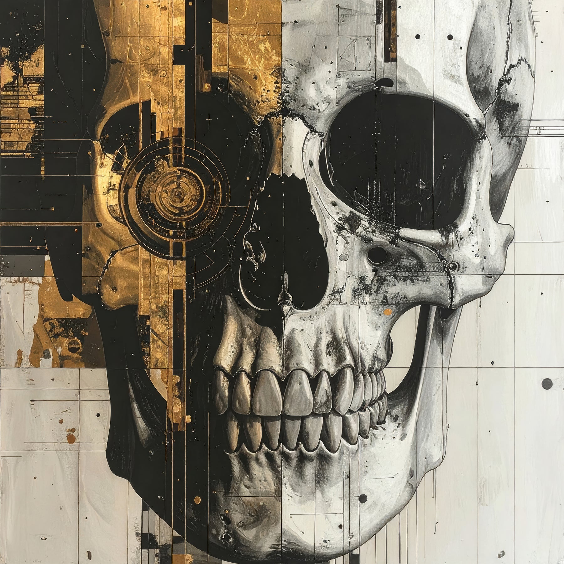 After the Bloom I depicts a skull in a fragile balance between decay and rebirth. Layered structures, technical lines, and gold accents contrast with raw, almost surgical details. The image feels like a moment after bloom: when beauty doesn't fade, but transforms.